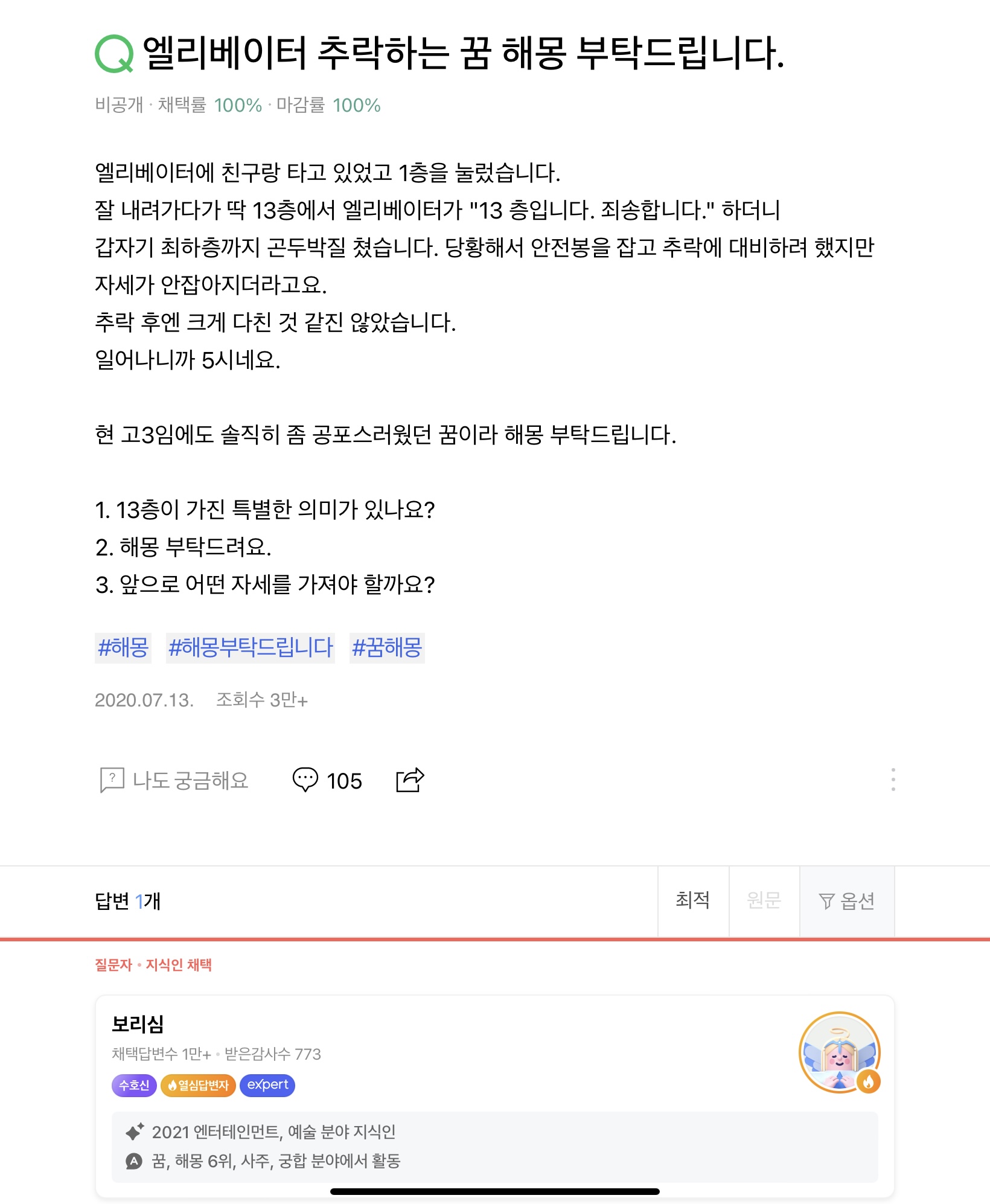 엘리베이터 추락하는 꿈 해몽 부탁드립니다. 엘리베이터에 친구랑 타고 있었고 1층을 눌렀습니다.잘 내려가다가 딱 13층에서 엘리베이터가 "13 층입니다. 죄송합니다." 하더니갑자기 최하층까지 곤두박질 쳤습니다. 당황해서 안전... m.kin.naver.com 손오공이 주인공이 아닌 드래곤볼 극장판/스페셜.gif<종이의 집> 한국판에서 반응 좋은 럽라.jpg (당연히 스포)10만 마일 주행테스트하는 자동차[환승연애] 헤어지면 평생 남이라고 생각하는 남자가 전여친이 나오는 이 방송에 출연한 이유 (스압)전세사기 당했을 때 이렇게 문자 남기세요