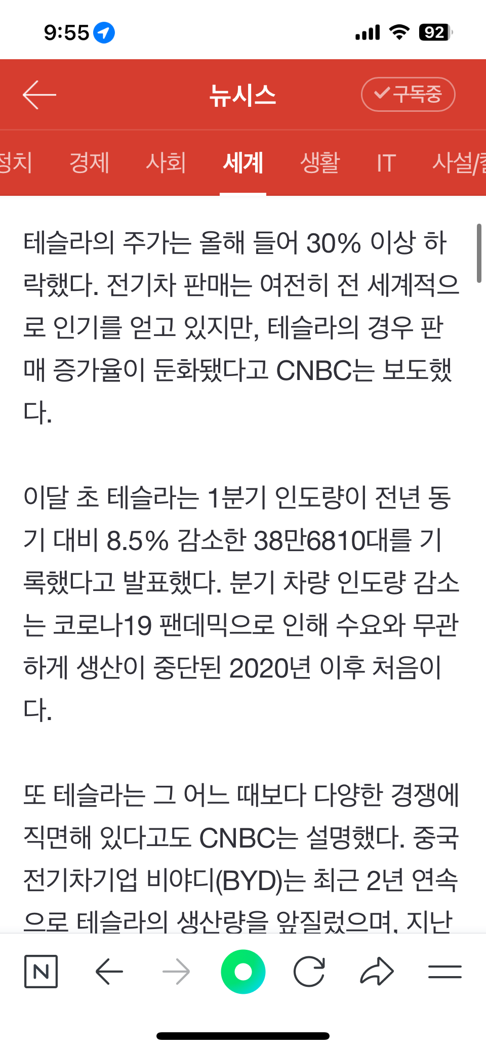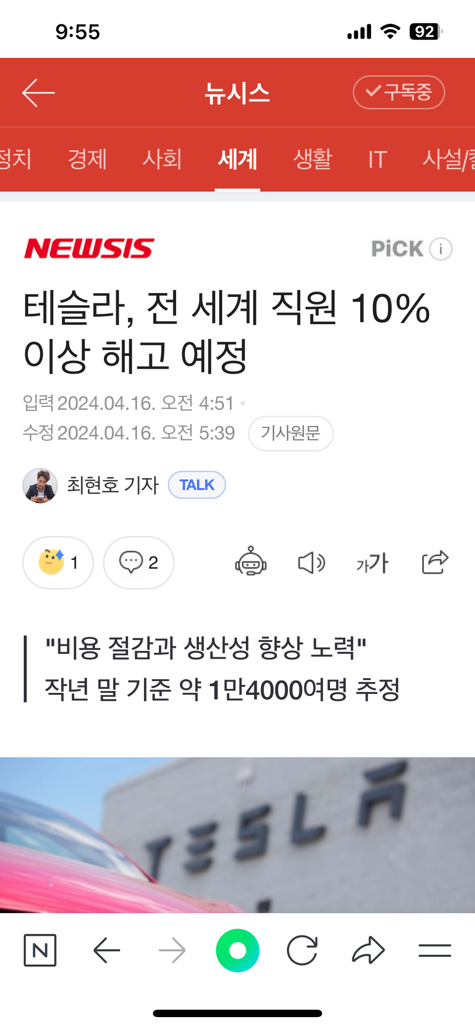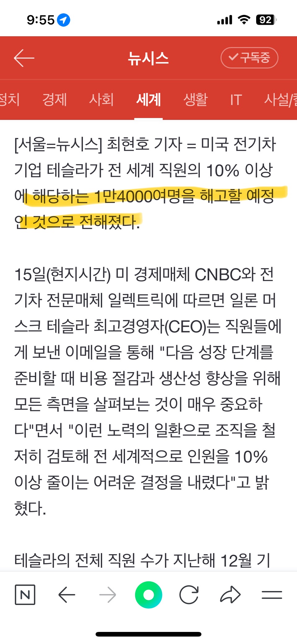 테슬라, 전 세계 직원 10% 이상 해고 예정 미국 전기차기업 테슬라가 전 세계 직원의 10% 이상에 해당하는 1만4000여명을 해고할 예정인 것으로 전해졌다. 15일(현지시간) 미 경제매체 CNBC와 전기차 전문매체 일렉트릭에 따르면 일론 머스크 n.news.naver.com 주인없을때 불안해 하는 강아지를 달래주는 고양이🥹LA에서 핫한 한국식 카페주인 몸에서 다른강아지 냄세가 난다는걸 확인한 댕댕이우리집 개는 진짜 안물어요세계에서 제일 비싼 약