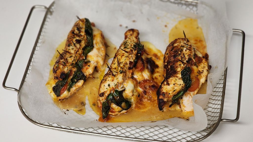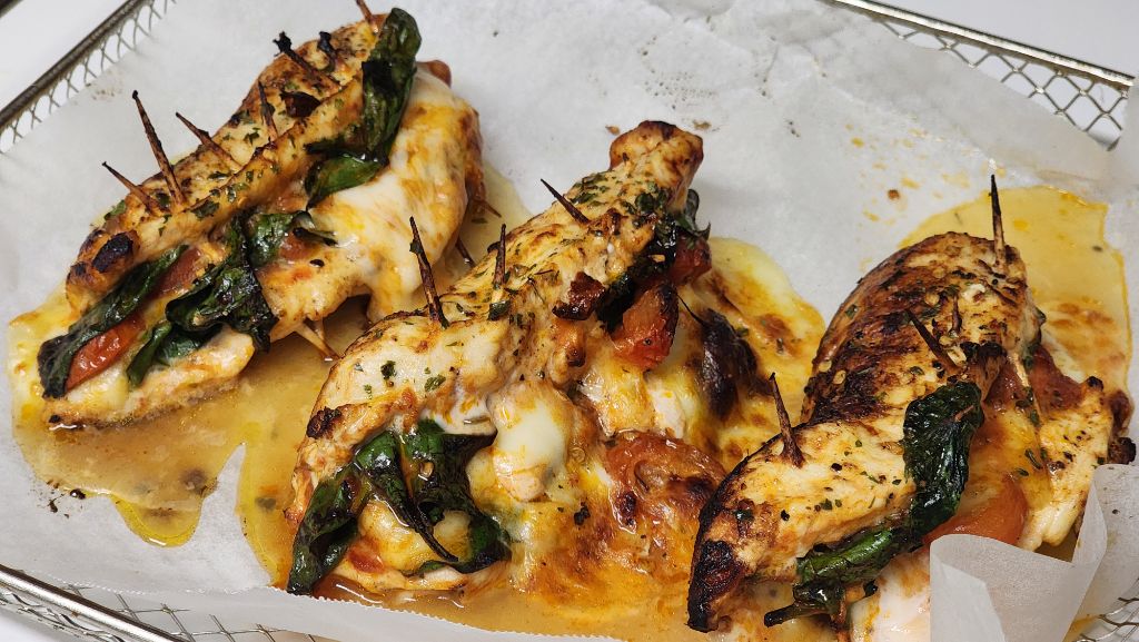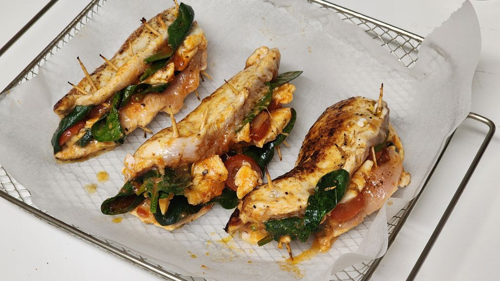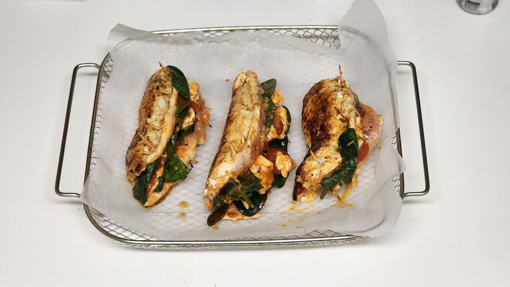 이제 겉면이 익은 닭찌찌를 에어프라이어에 180도/10분 구워줘.