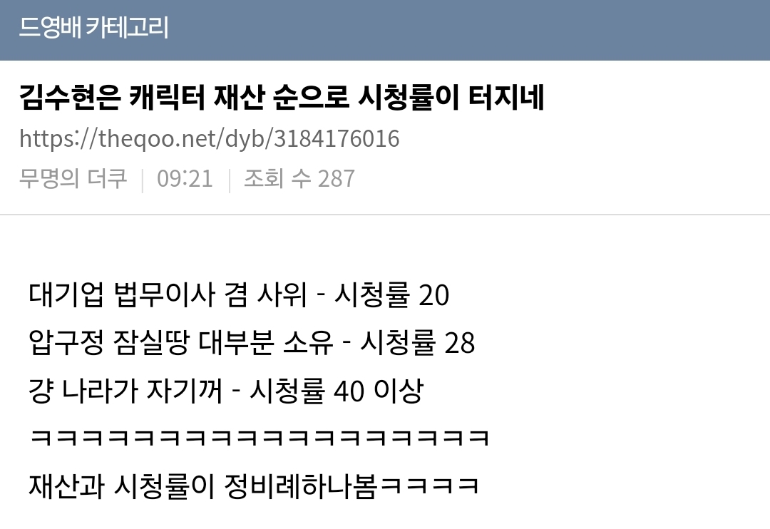 캐릭터 재산 순으로 드라마 시청률 터지는 김수현...gif