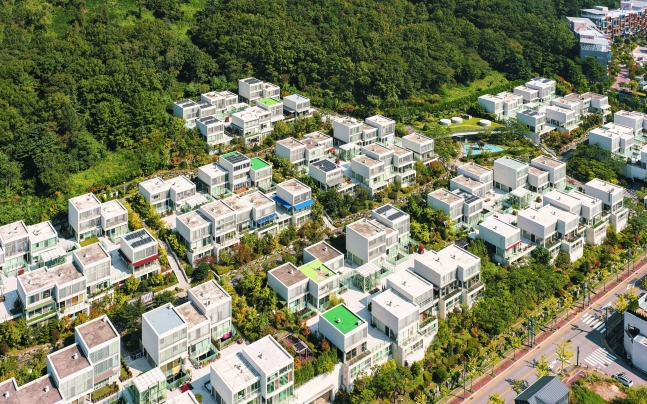 야마모토가 설계한 한국 판교하우징 - 건축가 야마모토 리켄이 2010년 설계한 타운하우스 ‘판교하우징(경기 성남 산운2단지월든힐스)’의 전경. 100가구가 사는 공동 주거 시설인 이곳은 10가구씩 공유하는 정원들을 배치해 주민 간 소통을 강조한 것이 특징이다. 초기 분양 당시 사생활 침해 논란으로 미분양이 났지만, 지난 2020년 주민들이 야마모토 리켄을 초청해 감사 인사를 전할 만큼 주거 만족도가 높다고 한다. /사진가 남궁선