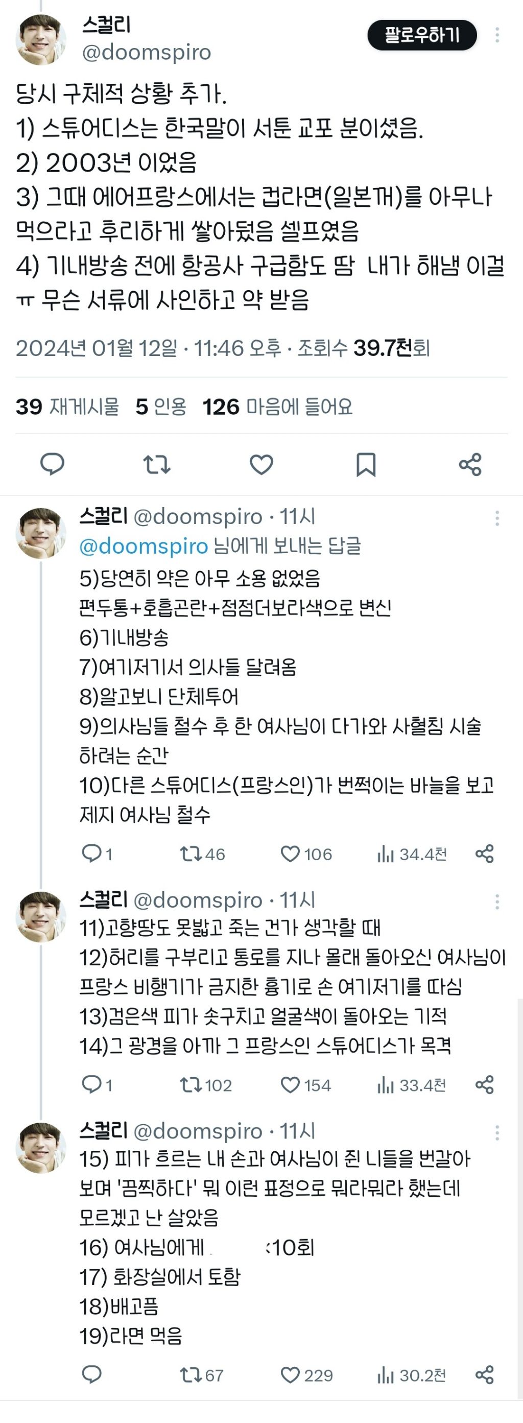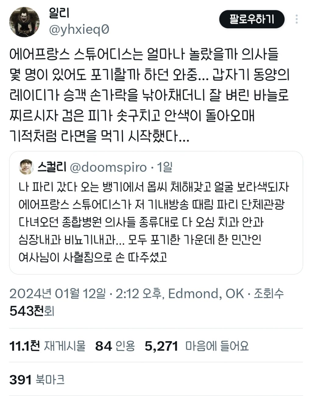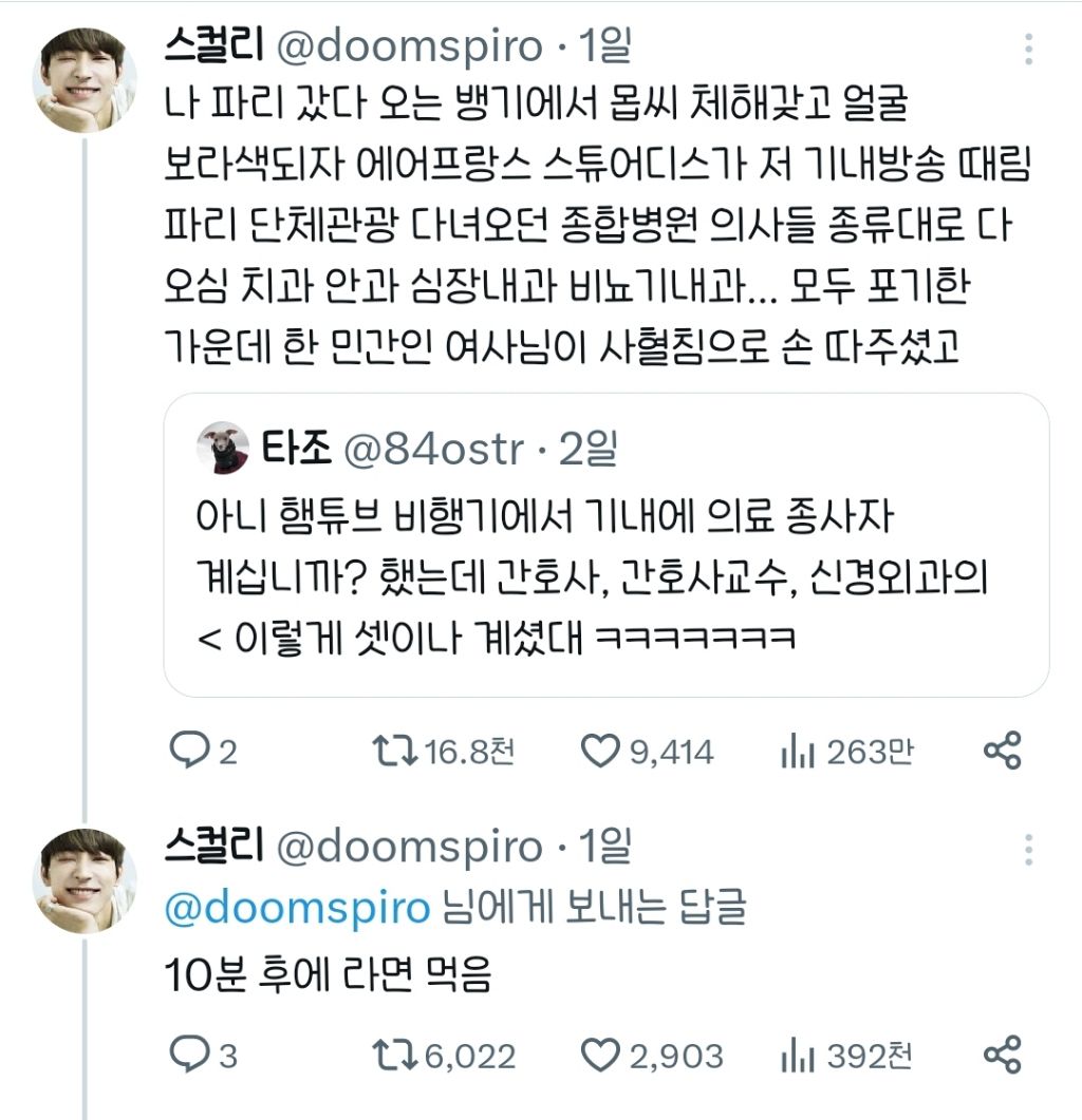 X의 스컬리님(@doomspiro) 나 파리 갔다 오는 뱅기에서 몹씨 체해갖고 얼굴 보라색되자 에어프랑스 스튜어디스가 저 기내방송 때림 파리 단체관광 다녀오던 종합병원 의사들 종류대로 다 오심 치과 안과 심장내과 비뇨기 twitter.com [알콜지옥] 거울치료 제대로라는 알콜중독자들 취한 모습.gif예방접종 받는 양들[종편]수학 영재였던 금쪽이가 6개월 전부터 갑자기 폭력적으로 변했다는 사연부산 서면 노포 청국장[주문을 잊은 음식점] 첫 제자를 만난 할아버지