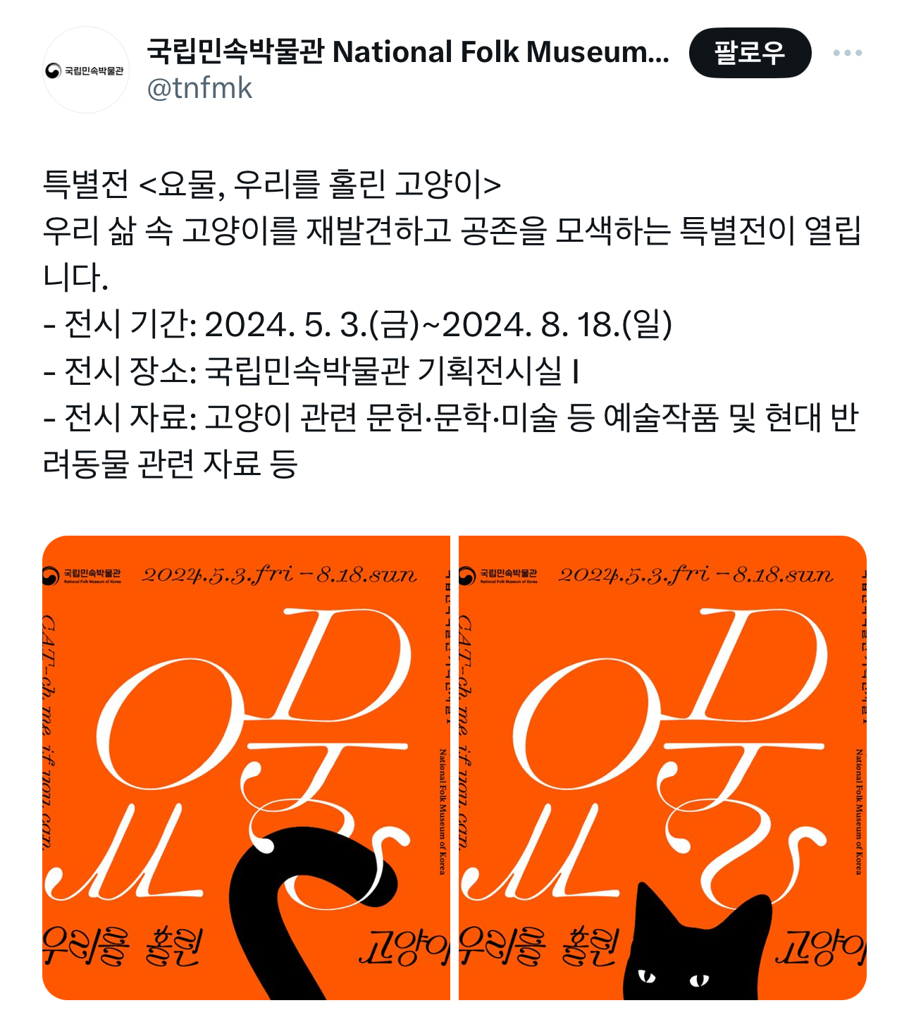 X의 국립민속박물관 National Folk Museum of Korea님(@tnfmk) 특별전 <요물, 우리를 홀린 고양이> 우리 삶 속 고양이를 재발견하고 공존을 모색하는 특별전이 열립니다. - 전시 기간: 2024. 5. 3.(금)~2024. 8. 18.(일) - 전시 장소: 국립민속박물관 기획전시실 Ⅰ - twitter.com 여성시대 바나나스플릿구슬 어리둥절 빨리지 않는 빨대...gif골키퍼의 빠른 반응쫄깃하고 부드러운 빅마마의 탱글 수육오락실 세대의 세대 차이오늘 같은 지역에서 규모 5 이상 지진 5번 난 대만...jpg