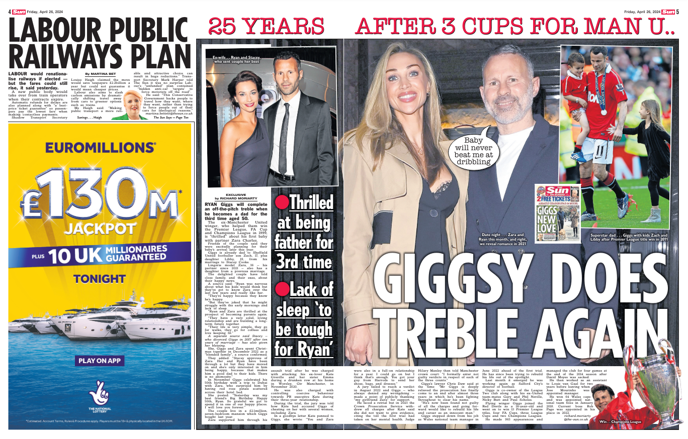 라이언 긱스는 50세의 나이에 세 번째 아빠가 되어 경기장 밖에서 트레블을 달성하게 된다. 긱스는 파트너인 자라 찰스와의 첫아기에 대해 "감격스럽다"고 말했다.
