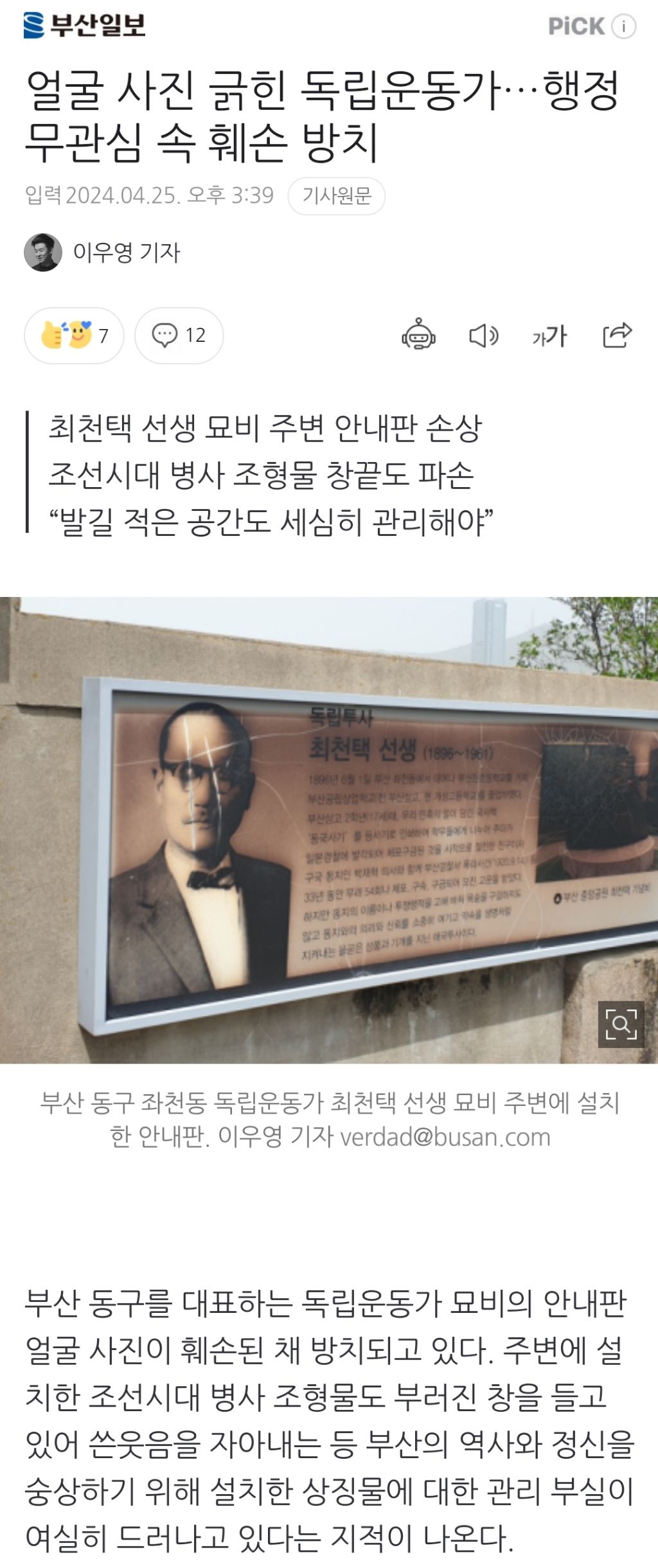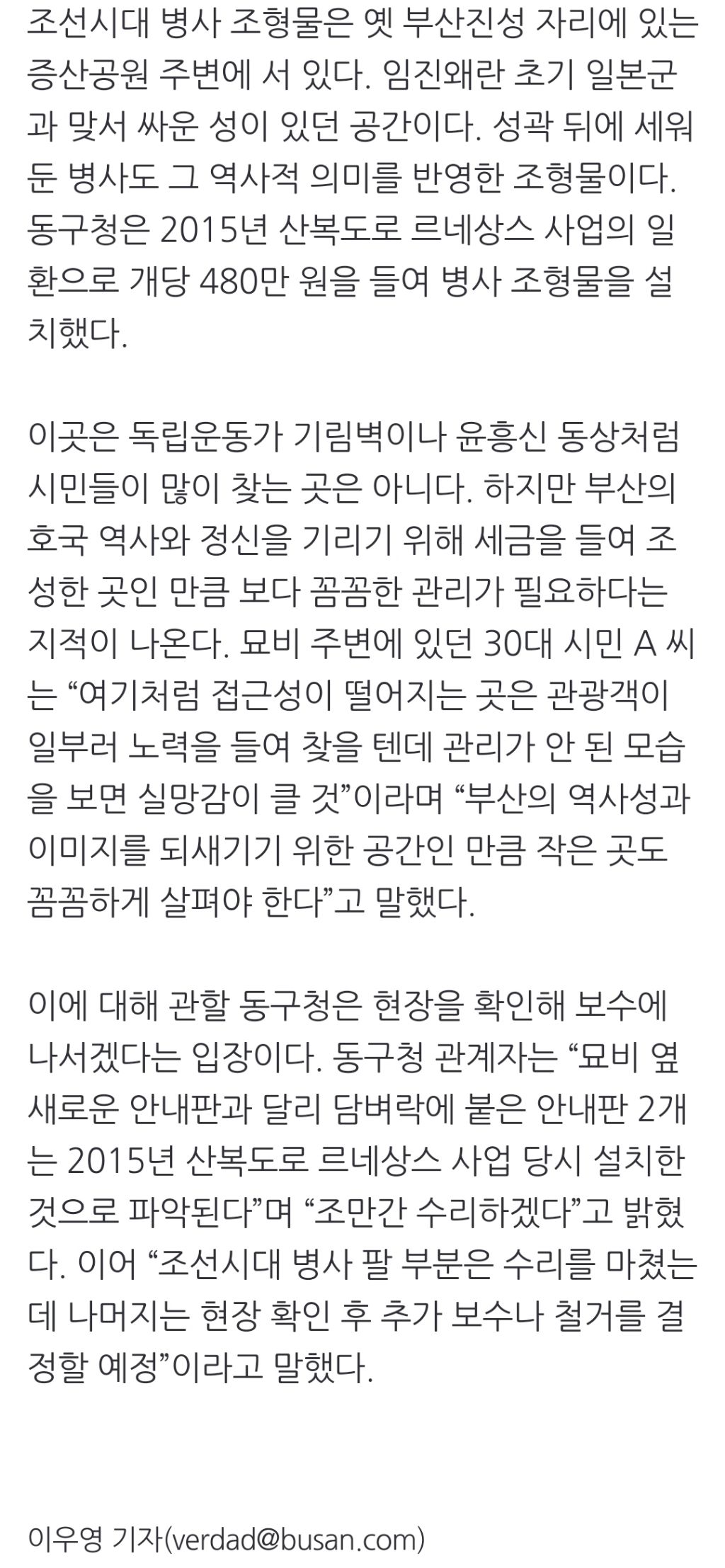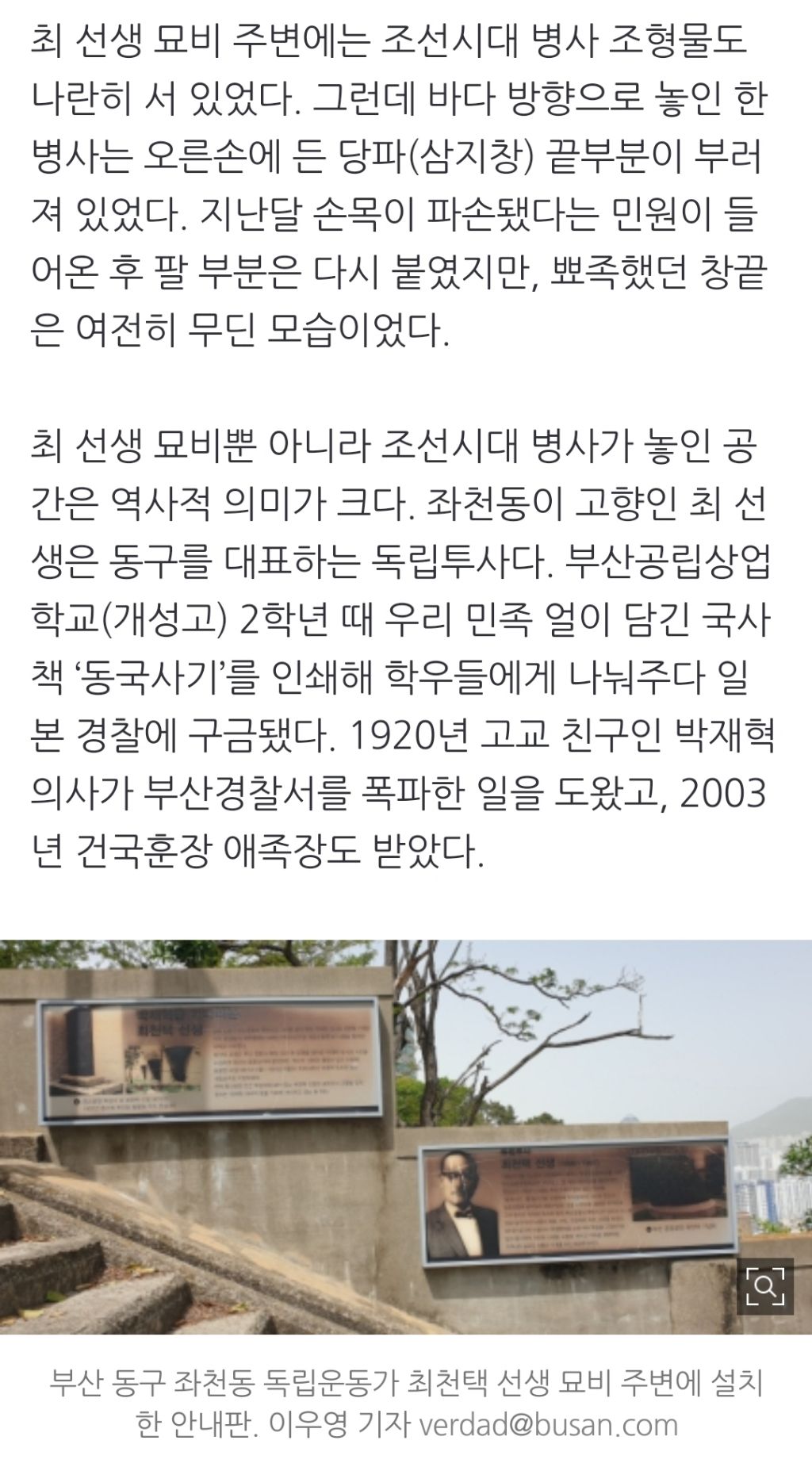 얼굴 사진 긁힌 독립운동가…행정 무관심 속 훼손 방치 부산 동구를 대표하는 독립운동가 묘비의 안내판 얼굴 사진이 훼손된 채 방치되고 있다. 주변에 설치한 조선시대 병사 조형물도 부러진 창을 들고 있어 쓴웃음을 자아내는 등 부산의 역사와 정 n.news.naver.com 전문 출처로중략 평소에 은근 액세서리 많이 하는 편인 정은지....jpgif[바오가족] 말 많은 송바오때문에 애타는 아이바오ㅋㅋㅋㅋㅋ김종국 : 운동 맨날 해도 재밌어!지선 - 이별 못한 이별(내 이름은 김삼순ost)카메라 이슈나온 대전구장.gif