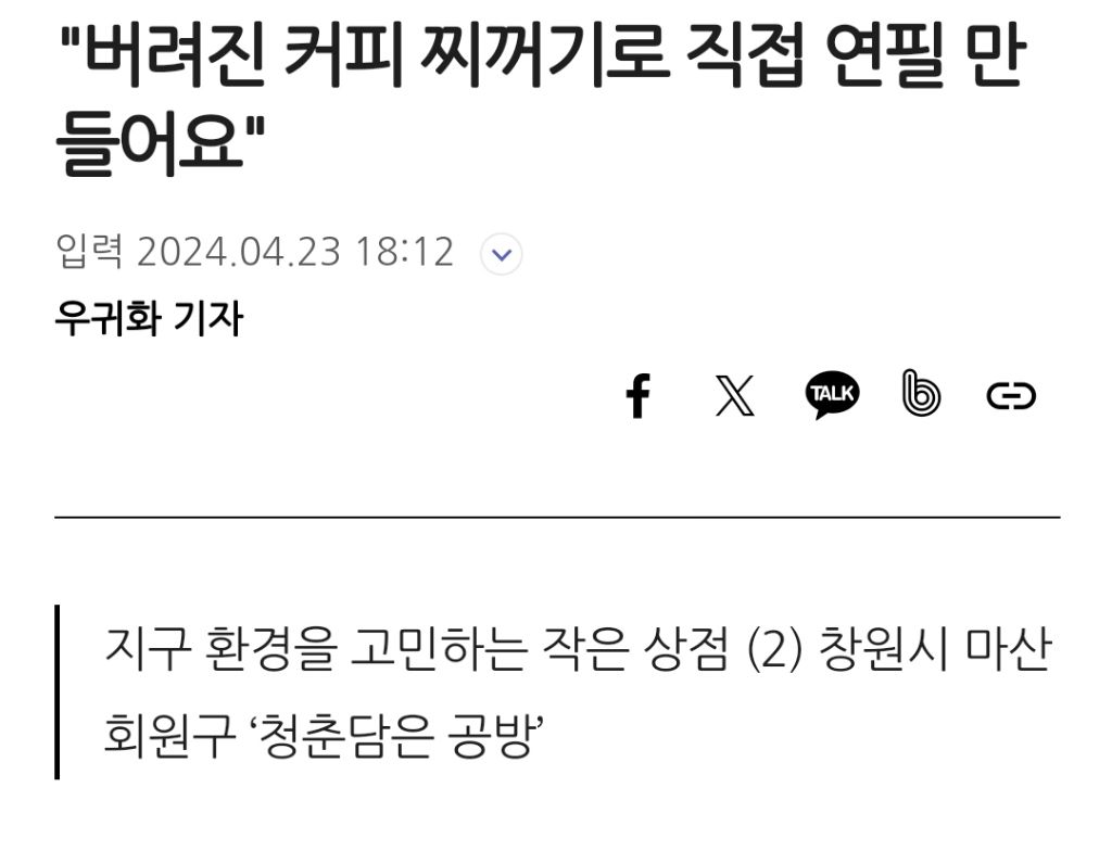 "버려진 커피 찌꺼기로 직접 연필 만들어요" 지구의 날(4월 22일)을 맞아 지구 환경을 고민하며, 지속 가능한 생활을 위해 노력하는 경남의 작은 상점 3곳을 소개합니다. 쓰레기를 줄여 나가기 위한 생활용품을 판매하는 제로웨이스트 상점, www.idomin.com 이하 생략전문 출처로 김은숙이 제일 이해 안 된다는 2030이 하는 말.jpg윤하의 <사건의 지평선>이 타이틀임에도 11번 트랙에 위치한 이유[웨스트햄 vs 리버풀] 앤디 로버트슨 동점골 ㄷㄷㄷㄷㄷㄷㄷㄷ.gif어깨는 쓰면 쓸수록 강하다는 것을 증명함.gifKBO 순위와 팀성적