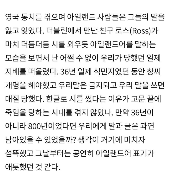 아일랜드에 'Police'가 없는 이유, 듣고나니 짠해졌다 비영어권 나라의 경찰복에도 Police 표기가 익숙할 정도인데 영어가 공용어인 나라에서 경찰만 영어 없이 Garda라니? 의문과 호기심으로 아일랜드를 여행하는 동안 열심히 찾아보았다. ‘Police는 www.joongang.co.kr 아일랜드는 Police 대신 Grada를 사용한다고 함추가) 감자대기근 [울산 vs 제주] 조현우 날아올라 ㄷㄷㄷㄷㄷㄷㄷㄷ.gif애 세명 낳고 33살에 서울대 법대 들어가서 변호사 된 사람은근 귀여운 바위 너구리40대가 되면서 느끼는 행복의 조건.jpg수지도 집에선 걍 둘째인거임........jpg