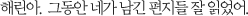 은호의 집에 올 때마다 몰래 고백의 편지를 책 사이에 숨겨두었음.언젠가 은호가 보길 기다리며."해린아, 너 저번에 책 안가져갔더라.""온 김에 찾아가." 항상 그 자리에 그대로 있던 편지를 보며아직도 은호가 편지를 못봤다고 생각함.그런데 은호가 알려준 자리에는 다른 편지가 꽂혀있음.바로 해린에게 보내는 은호의 편지. 드라마 로맨스는 별책부록 中 토트넘 v 아스날 - 사카 골100시간 동안 PC방에서 살기.jpg플라잉 캐치+멀티히트...삼성의 뜨거운 봄, 그 중심에 구자욱 [IS 스타]어느 상황이 제일 짜증날까? 떡복이 대참사 모음백현우의 미래