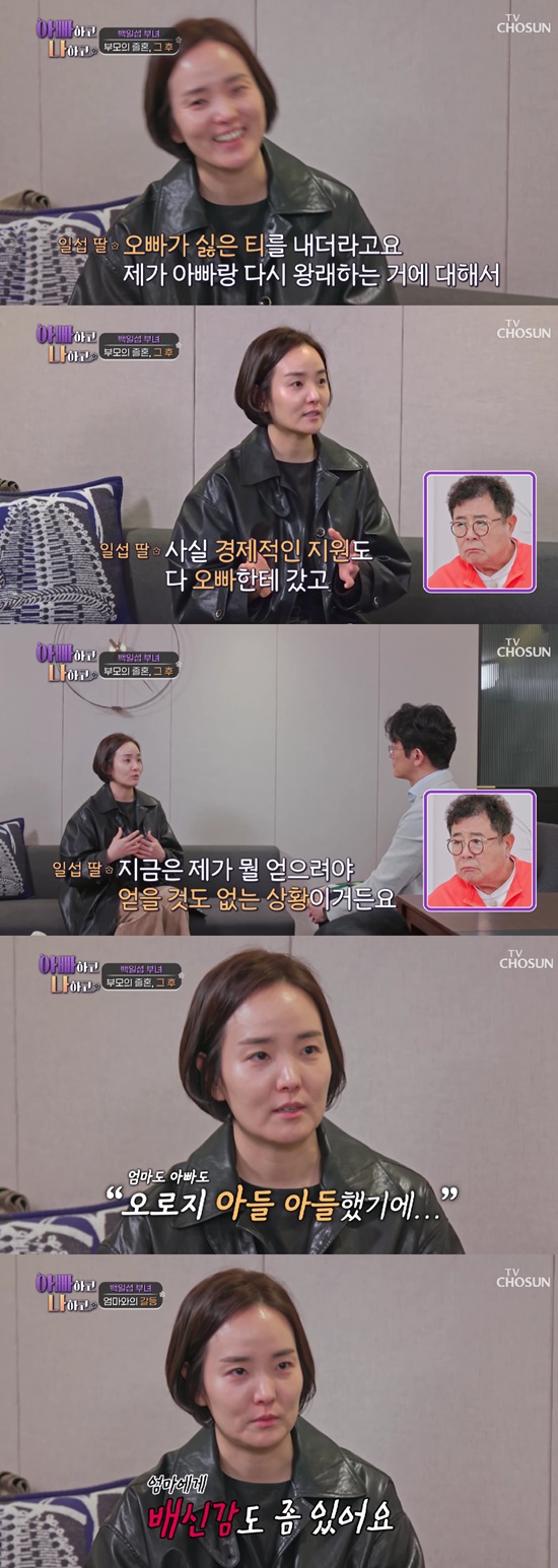 백지은은 "제가 아빠랑 다시 만나는 것에 대해 오빠가 싫은 티를 내더라"며 "질투일까요? 제가 한 건 없다. 경제적인 지원도 다 오빠에게 갔다. 지금 전 얻을래야 얻을 것도 없는 상황이다. 엄마도, 아빠도 오로지 '아들, 아들' 하시던 분들이다"라며 부모의 차별을 이야기했다.