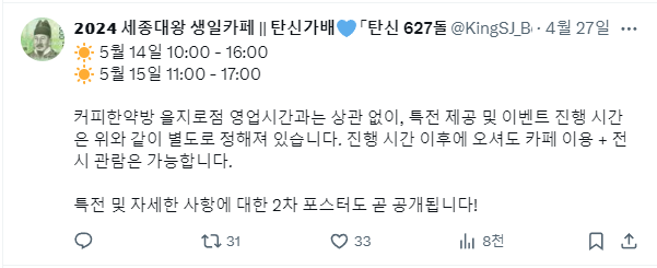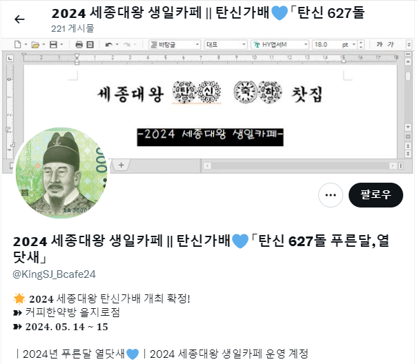 — 𝟮𝟬𝟮𝟰 세종대왕 생일카페 || 탄신가배💙「탄신 627돌 푸른달,열닷새」 (@KingSJ_Bcafe24) April 27, 2024