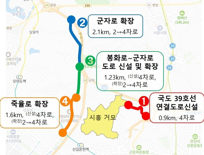 군자로 확장, 죽율로 확장, 봉화로∼군자로 도로 신설 및 확장 사업은 보상과 공사가 동시에 진행된다. 이로써 사업 기간이 12개월 단축, 거모지구 북서 측의 병목 현상이 해소될 것으로 대광위는 기대하고 있다. 이들 사업은 오는 2029년 완공을 목표로 하고 있다.