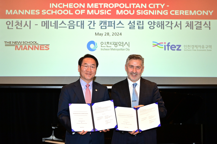 이날 체결식에는 유 시장을 비롯해, 메네스 음대의 모(母) 학교 그룹인 뉴스쿨의 린다 라파포트 이사회 의장, 리차드 케슬러 메네스 음대 대표, 윤원석 인천경제자유구역청장 등이 참석했다.
