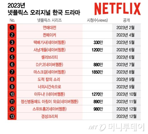 2023년 넷플릭스 오리지널 한국 드라마/그래픽=이지혜 '2000조 메가뱅크' 미즈호가 '살롱' 차린 이유 "이 고객 위해서죠"챗GPT의 아버지 "재산 절반이상 사회환원" 약속인도네시아에 韓 의료AI 심는다…웨이센, 현지 병원에 솔루션 공급광화문에 스타트업 베이스캠프 생긴다…10억 규모 펀드도 조성XR 산업 주축으로 '동북권 창업생태계' 육성…SBA-도봉구 맞손