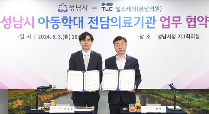 경기 성남시는 3일 시청 4층 제1회의실에서 신상진 성남시장과 이의성 티엘씨헬스케어 대표, 현혜연 티엘씨분당의원장 등이 참석한 가운데 ‘아동학대 전담의료기관 지정에 관한 업무협약’을 맺었다.