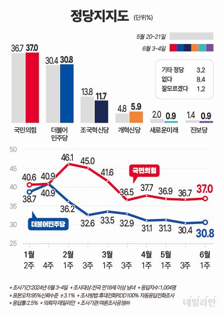 같은 조사에서 정당 지지도는 국민의힘이 37.0%, 민주당이 30.8%로 나타났다. 국민의힘은 직전 조사보다 0.3%p, 민주당은 0.4%p 상승했다.