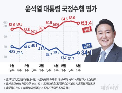 데일리안이 여론조사 전문기관 여론조사공정㈜에 의뢰해 지난 3~4일 100% 무선 ARS 방식으로 조사한 결과, 윤 대통령의 국정수행 긍정평가는 34.1%(매우 잘함 16.8%·잘하는 편 17.3%), 부정평가는 63.4%(매우 못함 54.2%·못하는 편 9.2%)로 집계됐다. 직전 조사(5월 20~21일) 대비 긍정평가는 2.4%p 상승했고, 부정평가는 2.2%p 하락했다.