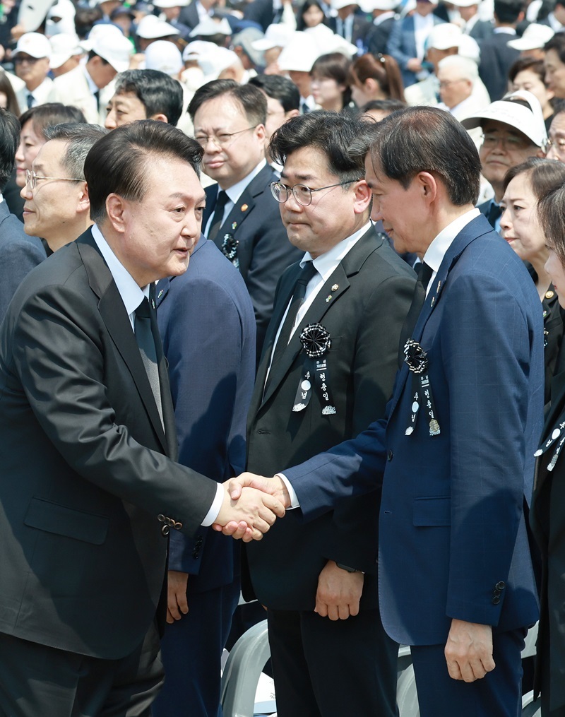 조국 조국혁신당 대표가 6일 현충일 추념식에서 윤석열 대통령과 악수했다.
